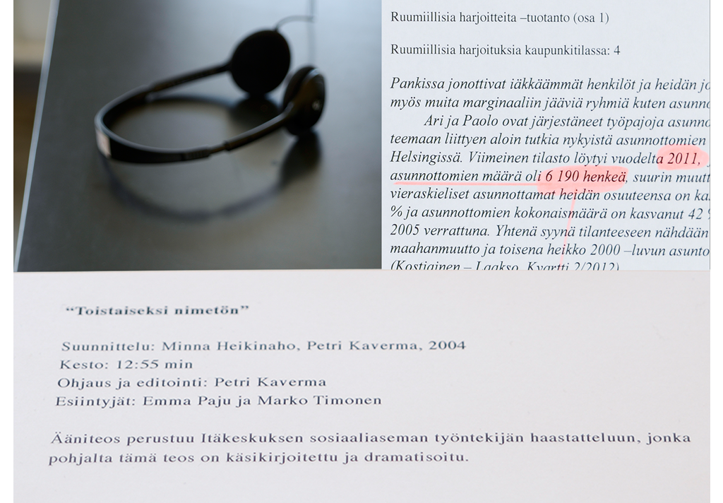 Ruumiillisia harjoitteita taideproduktio koostui, Toistaiseksi nimetön kuunnelmasta ja tekstiosasta, joka kehittyi prosessimaisesti näyttelyn aikana.