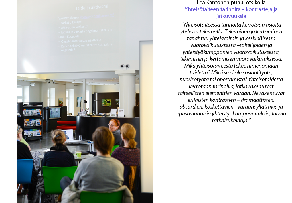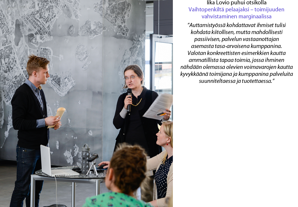 Osallistava toiminta marginaalissa, tarvitaanko sitä –seminaari. keskittyi osallisuuteen ja osallistavaan toimintaan. Seminaari oli suunnattu sosiaalityön, taiteen ja muotoilun ammattilaisille, jotka työssään kohtaavat marginaalissa olevia ihmisiä ja osallistavia tilanteita.
