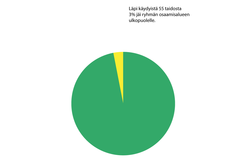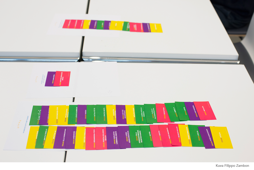 OSAAN korteista kertyy pinoja sen mukaan miten osallistujilla tai heidän lähipiirillään on lueteltuja taitoja. Korttien tarkoitus on tuoda esiin yhteisössä piilevää osaamista ja mahdollisuuksia.